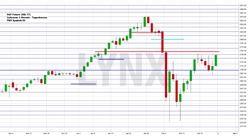 Die wichtige Unterstützung von 2.700,00 im S&P Future wurde gehalten, der Markt stieg über das Schlusskursniveau der letzten Woche und zeigte erneut die angenommene Stärke der vorletzten Handelswoche. Das Wochentief lag kurzzeitig unterhalb von 2.700,00 und das Wochenhoch nahe des Widerstandes von 2.750,00. Auch der Wochenschlusskurs lag etwa in diesem Bereich. Jetzt ist es entscheidend, ob der Markt es schafft, die Stärke der letzten zwei Handelstage zu halten und den wichtigen Widerstand von rund 2.760,00 Punkten zu überschreiten. Sollte diese Bewegung vollzogen werden, wäre dies als ein Zeichen von Stärke zu werten und weitere Kurse in Richtung 2.800,00 wären realistisch. Kurse unterhalb von 2.720,00 wären für die Aufwärtsseite gegebenenfalls etwas kontraproduktiv und Käufe sollten mit Vorsicht angegangen werden. Ein Absacken unter die wichtige Unterstützung von 2.700,00 würde die Abwärtsgedanken in den Fokus rücken und Verkäufe in Richtung 2.660,00 wären ebenfalls denkbar.