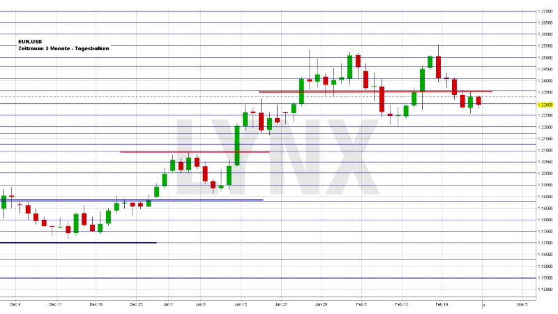 Am Montag der vergangenen Handelswoche startete der EUR.USD einen erneuten Versuch, um aus dem Unterstützungsniveau nach oben zu starten, erzielte jedoch keine nennenswerten Erfolge. Zum Dienstag fiel der Markt unter den wichtigen Unterstützungsbereich von 1,2350 und vorsichtige Abwärtsversuche konnten kleinere Gewinne verzeichnen. Der Zielbereich von 1,2200 konnte jedoch vorerst noch nicht erreicht werden, das Wochentief lag knapp oberhalb von 1,2250. Der Wochenschluss lag unterhalb von 1,2350 im Kursbereich 1,2295. Auch in der kommenden Handelswoche ist es denkbar, dass sich unterhalb von 1,2350 die Abwärtsseite weiterhin durchsetzt und die aktuelle Abwärtsbewegung in Richtung 1,2200 fortgesetzt wird. Weitere Tiefs sind daher nicht ausgeschlossen. Ein erneutes Steigen über die wichtige Marke von 1,2350 könnte für einen Versuch der Bullen sprechen und Kurse bis hinauf auf 1,2450 wären nicht auszuschließen.