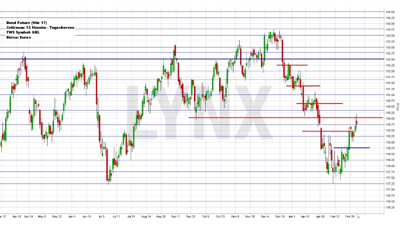 Oberhalb von 158,75 konnte der Bund-Future in der vergangenen Handelswoche seine Aufwärtsreise bis in den angepeilten Zielbereich von 160,00 ohne Probleme fortsetzen. Verschiedene Setups nach Rücksetzern oder nach Ausbrüchen ergaben potenzielle Einstiege für interessante Gewinne. Zum Freitag gab der Markt aus dem Zielbereich von gut 160,00 Zählern leicht ab und endete minimal oberhalb von 159,75. Der Blick auf das übergeordnete Bild zeigt eindeutig, dass der Markt bei der 160,00-Punkte-Marke an einem richtungsentscheidenden Bereich hängen geblieben ist. Es ist jetzt durchaus denkbar, dass sich in den kommenden Handelstagen die Abwärtsseite erneut durchsetzen und somit der Kernabwärtstrend wieder aufgenommen wird – allerdings erst, wenn der Markt nennenswert unter die Unterstützung 159,00 fällt. Ein grundsätzlicher Trendbruch wäre nicht auszuschließen, in diesem Fall wären Käufe oberhalb von 160,00 eine denkbare Option.