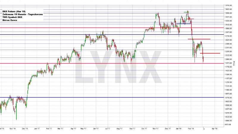Der Deutsche Aktienindex beendete den Xetra-Handel am Freitag mit einem Minus von 2,27 Prozent bei 11.913,71 Punkten. Das Rekordhoch liegt bei 13.596,89 Punkten. Das Handelsvolumen betrug 5,397 Mrd. Euro. Der XDAX notierte um 22:15 Uhr mit 11.995,38 Punkten und der FDAX schloss an der EUREX mit 11.990,50 Punkten. Der Dow Jones beendete den Handel mit 24.538,06 Punkten und die Rekordmarke liegt bei 26.616,71 Punkten. Der NASDAQ 100 notierte zum Handelsschluss bei 6.811,04 Punkten und der Rekordstand beträgt 7.022,97 Punkte. Der breit gefasste S&P 500 schloss mit 2.691,25 Punkten und der Rekordstand liegt bei 2.872,87 Punkten. Der Euro notierte nach US-Börsenschluss bei 1,2317 US-Dollar. Eine Feinunze Gold war am Spotmarkt für 1.322,75 US-Dollar zu haben und Rohöl der Nordseesorte Brent kostete zum US-Handelsschluss im Mai-Kontrakt 64,37 US-Dollar das Fass. Der Euro-Bund-Future schloss am Freitag an der EUREX mit 159,62 Punkten. Die Rendite für zehnjährige Bundesanleihen liegt aktuell bei 0,65 Prozent. Der Spread zwischen zehnjährigen deutschen Bunds und zehnjährigen US-Staatsanleihen (2,86 Prozent Rendite) liegt derzeit bei 221 Basispunkten. Die Bundesfinanzagentur emittiert am Mittwoch, den 07. März 2018 im Rahmen einer Aufstockung Kapitalmarktinstrumente (Bobl) mit einer fünfjährigen Laufzeit und mit einem Volumen von 4,0 Mrd. EUR.