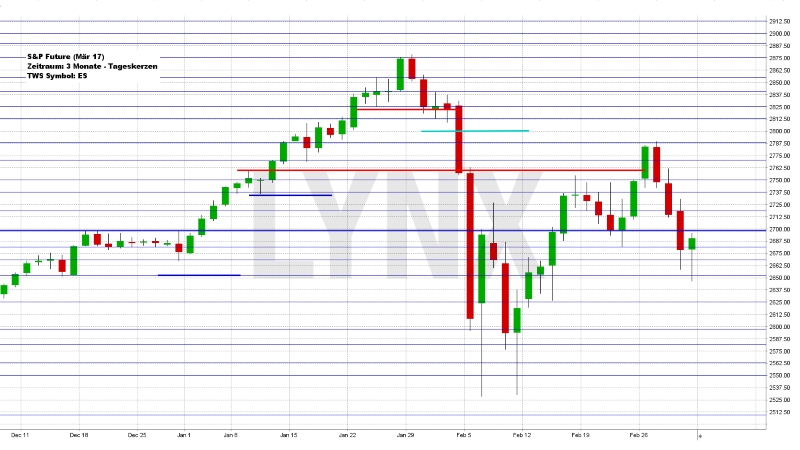 Der S&P-Future konnte in der vergangenen Handelswoche nur kurz Stärke beweisen. Nachdem es am Montag zu neuen Bewegungshochs kam, sackte er im Laufe der Handelswoche bis auf das Wochentief von rund 2.650,00 ab. Die Handelstage Dienstag bis Donnerstag waren zeitweise sauber abwärts gerichtet, am Freitag erholte sich der Markt jedoch wieder leicht bis zu einem Freitagsschlusskurs knapp vor der wichtigen Marke von 2.700,00. In der kommenden Handelswoche sollte die Marke von 2.700,00 richtungsentscheidend sein. Kurse darunter wären weiterhin mit einem Abwärtsvorteil versehen und weitere Verkäufe sind denkbar. Sollte es der S&P jedoch erneut über diesen Bereich schaffen, so sind Kurse – vorab bis 2.750,00 – ebenfalls denkbar. Käufe sollten jedoch vorerst eher defensiver angegangen werden.