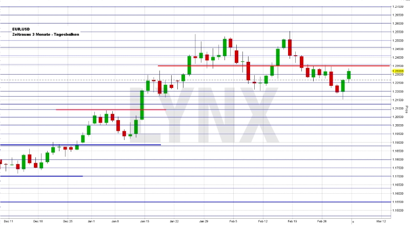 Bis zum Mittwoch der vergangenen Handelswoche setzte sich, wie angenommen, die Abwärtsseite durch und der EUR.USD rutschte bis auf das Unterstützungsniveau von 1,2150 ab. Zum Donnerstag setzte dann jedoch ein etwas stärkerer Rebound ein, der den Markt für die Handelswoche leicht in Plus drückte. Der Schlusskurs zum Freitagabend lag ein wenig oberhalb von 1,2300 und somit wenige Ticks höher als der Vorwochenschlusskurs. Wie in der vergangenen Handelswoche sollte auch in dieser Woche der Widerstandsbereich von 1,2350 die richtungsentscheidende Marke darstellen. Darüber liegende Kurse wären somit potenzielle Kandidaten für Käufe, wobei weitere Widerstande in geringen Abständen folgen. Unterhalb von 1,2350 könnte es gegebenenfalls erneut zu leichten Abgaben kommen und das Erreichen des Unterstützungsniveaus von 1,2200 ist durchaus denkbar.