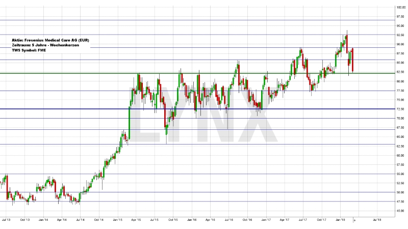 Mit Blick auf die letzten fünf Handelsjahre der Aktie von Fresenius Medical Care zeigt sich ein sehr positives Bild. Der Wert konnte sich aus dem Kursbereich von rund 50,00 Euro zeitweise bis auf gut 92,50 Euro hinaufarbeiten und rangiert auch mit dem Schlusskurs der letzten Handelswoche von rund 82,50 auf einem sehr starken Niveau. Zu beobachten war jedoch, dass der anfänglich saubere Aufwärtstrend von Juli 2014 bis April 2015 nicht in gleicher Art und Weise fortgesetzt werden konnte und in eine sehr volatile Phase überging. Stärkere Gegenbewegungen mussten diverse Male verkraftet werden, was eine saubere Trendfolge stark erschwerte. Neue Bewegungshochs wurden schnell wieder abverkauft, wodurch gerade Breakouts sehr unprofitabel wurden. Aus charttechnischer Sicht wird für die nähere Zukunft die wichtige Unterstützung von 82,50 Euro richtungsentscheidende sein. Sollte der Wert weiterhin oberhalb dieser Marke bleiben, ist es nicht auszuschließen, dass die Aktie erneut in Richtung 90,00 Euro steigen könnte und Käufe weiterhin interessant bleiben. Ein Rutsch unter diesen wichtigen Bereich könnte jedoch zu weiter fallenden Kursen führen, die durchaus zu einem generellen Trendbruch führen könnten. Mit Blick auf die vergangenen unsauberen Bewegungen ist der Wert wohl auch weiterhin nicht unbedingt die beste Entscheidung für einen sauberen trendfolgenden Handel.