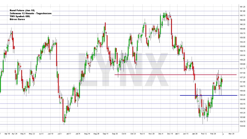 Wie angenommen prallte der Bund-Future am Widerstand knapp unterhalb der 157,50 ab. Daraufhin setzte kurzzeitig eine ausnutzbare Abwärtstendenz in Richtung des wichtigen Unterstützungsniveaus von 156,25 Punkten ein. Von dort prallte der Markt erneut nach oben ab, was zu einem Freitagsschlusskurs um die Marke von 157,00 führte. Alles in allem war die letzte Handelswoche relativ neutral und ohne nennenswerte Trendtendenzen. In dieser Woche wird sich zeigen, ob es der Bund-Future in einem zweiten Anlauf dauerhaft über den Widerstand von 157,50 schafft und es somit gegebenenfalls zu einem Trendwechsel kommen könnte. Ein Sprung über 157,50 könnte zu einem weiteren Anstieg, zunächst in Richtung 158,25 führen. Kurse unterhalb von 157,50 wären aus aktueller Sicht noch mit einem leichten Abwärtsvorteil verbunden, was durchaus zu einem erneuten Anlaufen der Unterstützung von 156,25 und bei nachhaltiger Schwäche auch zu dem Erreichen des Unterstützungsniveaus von 155,75 führen könnte.