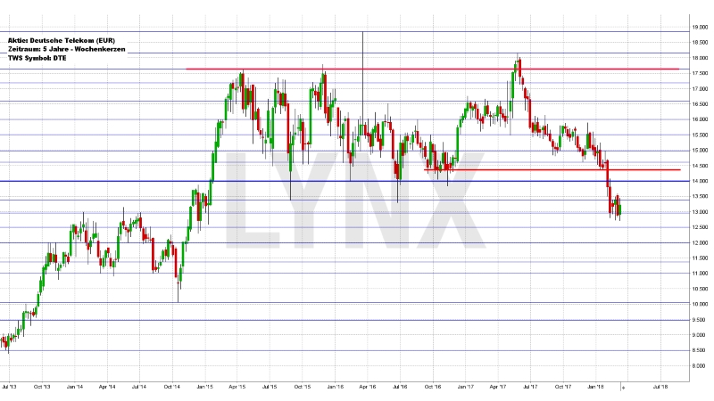 Die Aktie der Deutschen Telekom AG zeigte sich in den letzten fünf Handelsjahren überwiegend im Seitwärtstrend. Trendfolgende Handlungen waren schwer umsetzbar. Lediglich zwischen Mitte 2013 und Anfang 2015 trat eine verhältnismäßig saubere Aufwärtsbewegung auf, danach pendelte der Wert volatil zwischen 14,00 Euro und 17,60 Euro. Kürzlich fiel die Aktie unter die untere Seitwärtszonenbegrenzung,, was in der vergangenen Handelswoche zu einem Schlusskurs von gut 13,00 Euro führte. Charttechnisch gesehen könnte der Bruch durch die Unterstützung von 14,00 Euro bedeuten, dass sich für die Telekom-Aktie eine Abwärtstendenz ankündigt und Verkäufe eine interessante Option wären. Verkäufe unterhalb von 14,00 Euro mit dem vorläufigen Ziel von 12,00 Euro beziehungsweise 11,40 Euro wären somit gegebenenfalls denkbare Szenarien. Ein Rücklauf über 14,30 Euro wäre jedoch mit einem Rückfall in die genannte Seitwärtszone gleichzusetzen, womit Handlungen erneut eher uninteressant erscheinen würden.