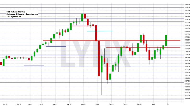 Gleich am Montag schlug der S&P Future die angepeilte Longrichtung ein. Am Freitag erreichte der S&P das Wochenziel von 2.750,00 und schoss in diesem Zuge direkt bis zu den Hochs von Ende Februar im Bereich von 2.787,50 Punkten. Käufe in den verschiedensten Szenarien waren somit denkbar und erfolgsversprechend. In den kommenden Handelstagen wird entscheidend sein, ob der S&P Future den Sprung über die Marke von 2.787,50 tatsächlich schafft und ob so der Weg in Richtung 2.812,50 frei wird. Leichte Rücksetzer oberhalb von 2.762,50 wären mit Blick auf das angenommene Longszenario denkbare Einstiegsmöglichkeiten. Ein Rutsch unter 2.762,50 könnte gegebenenfalls zu einem etwas stärkeren Rutsch in Richtung des nächsten wichtigen Unterstützungsniveaus von 2.730,00 führen. Käufe sollten in diesem Fall vorsichtigerer angegangen werden. Trendfolgende Verkäufe kämen, wenn überhaupt, erst nach einem Rutsch unter 2.730,00 in Frage.