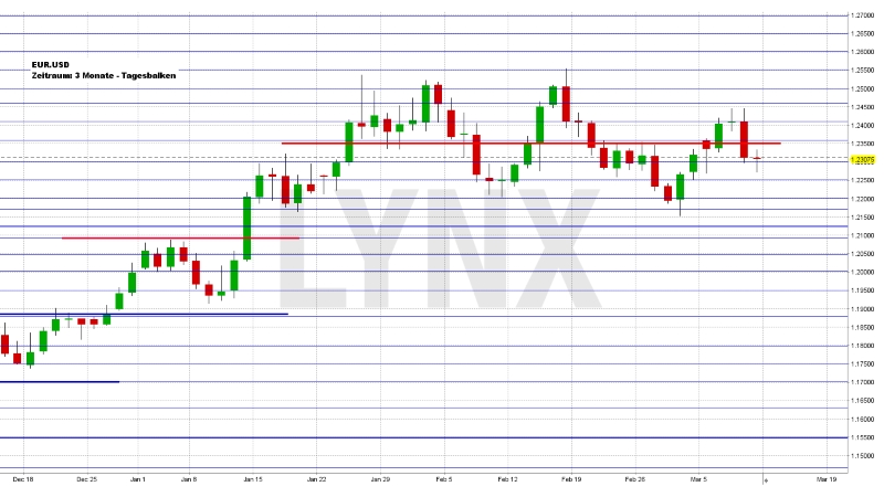 Wie angenommen stellte die Marke von 1,2350 eine entscheidende Widerstands- beziehungsweise Unterstützungsmarke dar und der EUR.USD pendelte im Wochenverlauf um diesen Bereich. Vorsichtige Käufe darüber und Verkäufe darunter konnten jeweils mit kleinen Gewinnen geschlossen werden. Der Schlusskurs zum Freitagabend lag knapp oberhalb von 1,2300 und damit annähernd auf dem Schlusskursniveau der Vorwoche. Damit stellt sich die vergangene Handelswoche als sehr nichtssagend dar. In den kommenden Handelstagen sollte wichtig sein, ob der Wert oberhalb oder unterhalb von 1,2350 handelt und ob das Vorwochenhoch beziehungsweise -tief wirkungsvoll durchstoßen werden kann. Long oberhalb von 1,2350 und Short unterhalb von 1,2350 wäre denkbar. Durch den derzeit seitwärts gerichteten Charakters des EUR.USD sollte jedoch prinzipiell mit Vorsicht agiert werden.