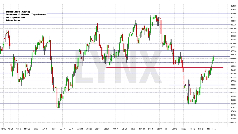 Der Bund-Future schaffte im zweiten Anlauf den Sprung über den Widerstand von 157,50 und stieg in sauberen Zügen direkt in den Zielbereich von 158,25. Nahezu jeder Handelstag der vergangenen Woche baute neue Bewegungshochs aus und Käufe waren ausnahmslos eine gute Wahl. Ausgehend vom Eröffnungskurs am Montag im Bereich 156,75 bis zum Schlusskurs nahe der Marke von 158,15 stieg der Markt 140 Ticks. Mit der letzten Handelswoche scheint aus charttechnischer Sicht die seit Anfang des Jahres bestehende Abwärtstendenz vorerst gebrochen, womit durchaus Potenzial auf der Longseite bestehen könnte. Kurse oberhalb von 157,75 beziehungsweise von 157,45 wären somit für Kaufszenarien durchaus interessant. Als realistisches Ziel könnte der Bereich kurz vor der Marke von 159,00 angenommen werden. Ein Absacken unter 157,45 wäre für Käufe aus aktueller Sicht gegebenenfalls etwas kontraproduktiv, Verkäufe sollten vorerst jedoch noch keinen nennenswerten Vorteil haben.