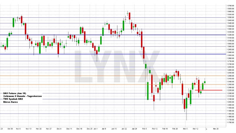 Nachdem der DAX-Future (FDAX) zu Beginn der letzten Handelswoche einen Ausflug unter die Unterstützung von 12.350 Punkten machte, stieg der Markt ab Mittwoch erneut nach oben und erreichte einen Wochenschlusskurs von rund 12.400 Punkten. Das entspricht einem Wochenplus von rund 50 Punkten. Das Wochenhoch lag am Montag knapp unterhalb von 12.500 und das Wochentief am Dienstag etwas oberhalb von 12.100 Punkten. Für die kommenden Handelstage bleibt interessant, ob ein dauerhafter Bruch der Seitwärtszone von 12.350 bis 12.500 nach oben oder unten stattfinden kann. Innerhalb dieses Bereichs sollte, wie bereits in der Vorwoche, mit Vorsicht agiert werden, da in charttechnischen Situationen wie dieser schnelle Richtungswechsel möglich und nur schwer zu handeln sind. Aus aktueller Sicht erscheint die Aufwärtsseite etwas interessanter und Käufe oberhalb von 12.250 könnten gewinnbringende Szenarien darstellen.