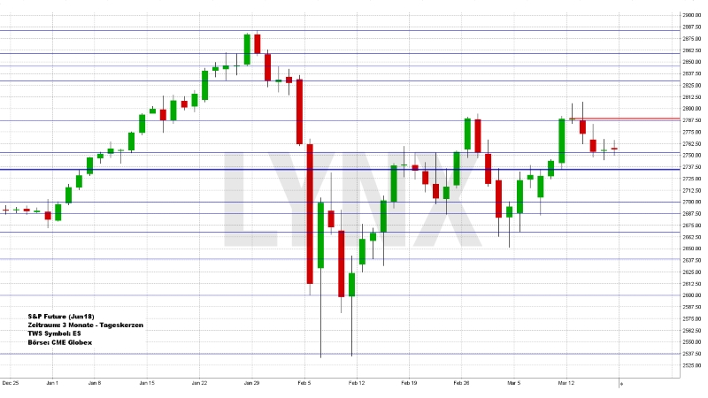 Der S&P-Future konnte die Hochs von Ende Februar nicht nachhaltig überschreiten und so sackte der Markt leicht in das Unterstützungsniveau bei 2.750,00 ab. Auf diesem Wege boten sich verschiedene Möglichkeiten für Käufe. Mit einem Schlusskurs knapp oberhalb von 2.750,00 stand der Markt zum Wochenschluss jedoch etwa 35 Punkte tiefer als in der Vorwoche, was nicht einmal die Aufwärtsbewegung des vorletzten Freitags bedeutete. Aus charttechnischer Sicht könnte in den nächsten Handelstagen durchaus die Chance auf erneut steigende Kurse bestehen – wenigstens solange der S&P Future nicht nachhaltig unter die Unterstützung von 2.737,50 sackt und damit ein wichtiges Unterstützungsniveau bricht. Das Erreichen der Hochs im Bereich 2.800,00 und folgend des Widerstandes 2.813,00 ist für Käufe realistisch. Ein nachhaltiger Rutsch unter 2.737,50 käme dem aktuellen Aufwärtsvorteil allerdings merklich in die Quere und Verkäufe in Richtung 2.700,00 wären ebenfalls eine denkbare Optionen, wenn auch mit einer etwas defensiveren Haltung.