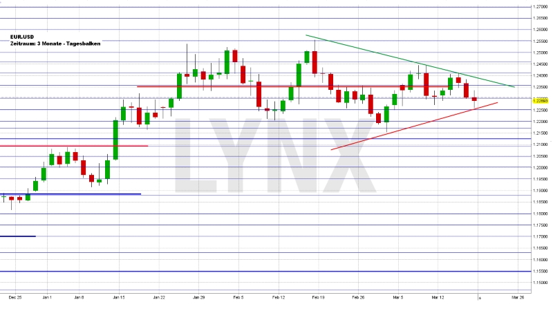 Die empfohlene Vorsicht durch die vorherrschende Seitwärtstendenz im EUR.USD hat sich in der vergangenen Handelswoche bewährt, da das Währungspaar erneut um die Marke von 1,2350 pendelte und keinen nennenswerten Trendvorteil aufbauen konnte. So waren zu Beginn der Handelswoche Käufe etwas interessant und ab Mittwoch bedingt Verkäufe. Das Wochenhoch lag knapp oberhalb der Marke von 1,2400 und das Wochentief kurz vor der Unterstützung 1,2250. Um eventuelle Trades einzugehen, sollte der EUR.USD in den nächsten Handelstagen aus seiner Seitwärtsrange ausbrechen. Ein eventueller Sprung über beziehungsweise unter die eingezeichneten Trendlinien könnte einen solchen Ausbruch ankündigen und den Startschuss für eine erneute Trendbewegung darstellen. Es ist jedoch nicht auszuschließen, dass das Währungspaar auch weiterhin seitwärts tendiert und somit sollte nach einem Ausbruch nicht sofort aggressiv agiert werden. Für Käufe wäre der Kursbereich 1,2500 durchaus realistisch, für Verkäufe die Unterstützung 1,2150.