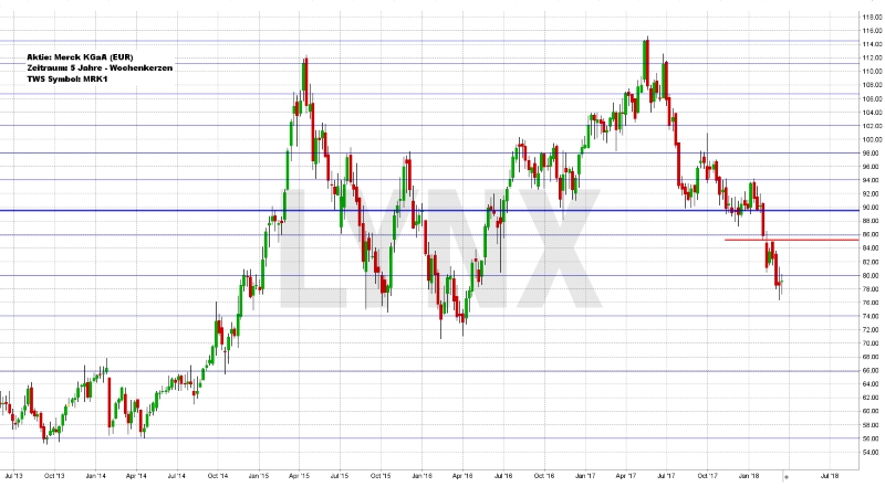 Der Verlauf der Merck-Aktie in den vergangenen fünf Handelsjahren lässt sich in vier Abschnitte teilen. Von Juli 2013 bis April 2015 tendierte der Wert sehr sauber aufwärts und entwickelte sich aus dem Kursbereich von rund 56,00 Euro kommend bis hinauf auf gut 112,00 Euro. Von dort setzte für etwa 12 Monate eine recht volatile Abwärtsbewegung ein, die ihr Ende im Bereich knapp vor der Unterstützung von 70,00 Euro fand. Darauf setzte eine erneute Rally in Richtung 112,00 Euro ein, die seit Mitte 2017 von einer zweiten Abwärtswelle abgelöst wurde. Alle Trends konnten – bis auf kleine Ausnahmen – sehr sauber ausgebaut werden. Somit waren trendfolgende Strategien sehr gut umsetzbar. Der aktuelle Schlusskurs der laufenden Abwärtsbewegung konnte am vergangenen Freitag im Bereich von 79,00 Euro abgelesen werden, nur knapp über dem aktuellen Bewegungstief. Aktuell scheint der Wert wenig Potenzial für Käufe zu haben, da eine saubere Tendenz fallender Tiefs und fallender Hochs abzulesen ist. Es ist somit realistisch, dass sich zeitnah weitere Bewegungstiefs ausbauen und die Unterstützungsniveaus von 74,00 Euro und folgend von 71,00 Euro angelaufen werden könnten. Aus aktueller Sicht wären Käufe also erst nach einem dauerhaften Überschreiten des Widerstandes von 85,50 Euro beziehungsweise nach einem Überschreiten des 90,00-Euro-Widerstandes wieder interessant. Antizyklisch und gleichzeitig sehr aggressiv wäre ein Kauf im Kursbereich von 70,00 Euro eine denkbare Option, da dort liegende Orders gegebenenfalls zu einem kleineren, aber ausnutzbaren Rebound führen könnten.