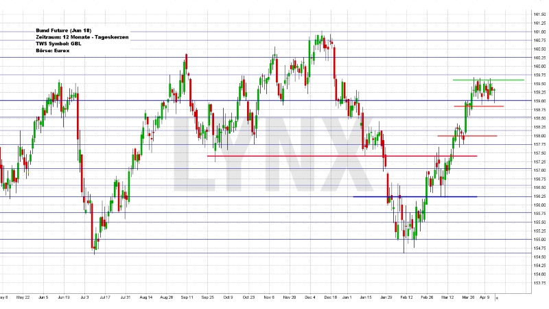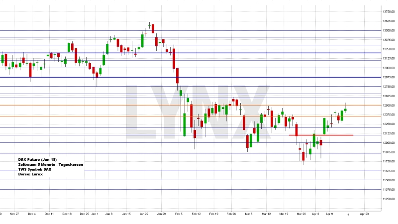Der Deutsche Aktienindex beendete den Xetra-Handel am Freitag mit einem Plus von 0,22 Prozent bei 12.442,01 Punkten. Das Rekordhoch liegt bei 13.596,89 Punkten. Das Handelsvolumen betrug 3,309 Mrd. Euro. Der XDAX notierte um 22:15 Uhr mit 12.455,38 Punkten und der FDAX schloss an der EUREX mit 12.462,50 Punkten. Der Dow Jones beendete den Handel mit 24.360,14 Punkten und die Rekordmarke liegt bei 26.616,71 Punkten. Der NASDAQ 100 notierte zum Handelsschluss bei 6.628,34 Punkten und der Rekordstand beträgt 7.186,09 Punkte. Der breit gefasste S&P 500 schloss mit 2.656,30 Punkten und der Rekordstand liegt bei 2.872,87 Punkten. Der Euro notierte nach US-Börsenschluss bei 1,2331 US-Dollar. Eine Feinunze Gold war am Spotmarkt für 1.346,20 US-Dollar zu haben und Rohöl der Nordseesorte Brent kostete zum US-Handelsschluss im Juni-Kontrakt 72,58 US-Dollar das Fass. Der Euro-Bund-Future schloss am Freitag an der EUREX mit 159,30 Zählern. Die Rendite für zehnjährige Bundesanleihen liegt aktuell bei 0,51 Prozent. Der Spread zwischen zehnjährigen deutschen Bunds und zehnjährigen US-Staatsanleihen (2,83 Prozent Rendite) liegt derzeit bei 232 Basispunkten. Die Bundesfinanzagentur emittiert am Mittwoch im Rahmen einer Aufstockung Kapitalmarktinstrumente (Bund) mit einer zehnjährigen Laufzeit und mit einem Volumen von 3,0 Mrd. EUR.