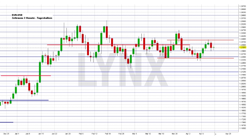 Der EUR.USD entschied sich in der vergangenen Handelswoche vorerst für einen erneuten Anstieg in Richtung 1,2400 und endete zum Freitagabend im Bereich 1,2330. Die schon seit Wochen laufende Seitwärtsphase konnte somit eine weitere Woche nicht verlassen werden und weder mit Käufen noch Verkäufen konnten große Gewinne produziert werden. Erneut wäre ein Ausbruch über 1,2390 für Käufe, beziehungsweise unter 1,2240 für Verkäufe interessant. Prinzipiell ist jedoch primär mit einer Weiterführung der Seitwärtszone zu rechnen, was nicht zwingend zu Handlungen führen sollte, da ein nötiger gewinnbringender Trendvorteil fehlt. Sollte der Markt nach oben ausbrechen, so wäre die Marke 1,2460 ein interessantes erstes Ziel und für einen Bruch nach unten die Unterstützung 1,2150.