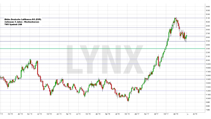Der Verlauf der Aktie der Lufthansa AG der vergangenen fünf Handelsjahre kann prinzipiell in drei Phasen unterteilt werden. Von Mitte 2013 bis Mitte 2014 stieg die Aktie aus dem 15,00 Euro Bereich kommend bis auf circa 20,00 Euro an, um dann bis Oktober 2016 bis auf rund 9,00 Euro abzurutschen. Ab dem Jahr 2017 stieg der Wert dann sehr stark und konnte ein Hoch im Bereich von 31,00 Euro ausbauen. Gerade der letzte Anstieg im Jahr 2017 war sehr markant aufwärts und ohne nennenswerte Rücksetzer. Seit Anfang 2018 steckt der Wert in einer leichten Konsolidierung, welche einen aktuellen Schlusskurs im Bereich von 26,50 Euro fand. Solange die Aktie oberhalb von 23,00 Euro notierte, besteht die Möglichkeit, dass es zur Wideraufnahme des Aufwärtstrends kommt. Das Erreichen der Hochs im Bereich von 31,00 Euro wäre dann definitiv als realistisch einzustufen. Sollte die Aktie jedoch nachhaltig unter 23,00 Euro absacken, so wäre die Aufwärtsseite als etwas unvorteilhafter zu bewerten und Käufe sollten zurückgenommen werden.