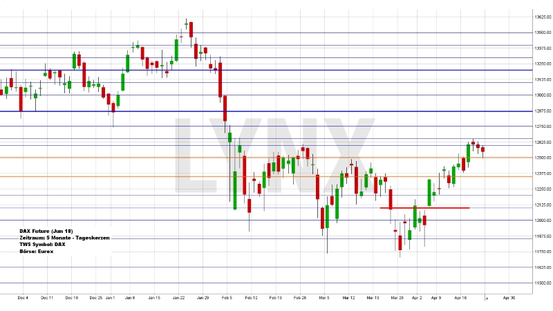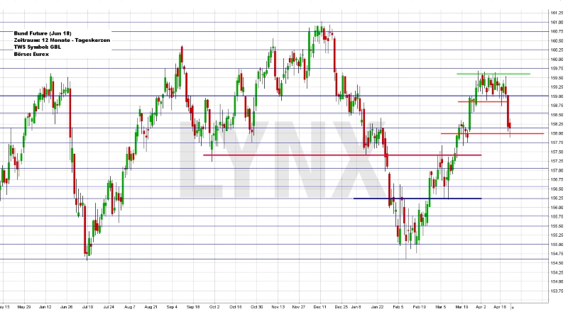 Der Deutsche Aktienindex beendete den Xetra-Handel am Freitag mit einem Minus von 0,21 Prozent bei 12.540,50 Punkten. Das Rekordhoch liegt bei 13.596,89 Punkten. Das Handelsvolumen betrug 4,822 Mrd. Euro. Der XDAX notierte um 22:15 Uhr mit 12.530,96 Punkten und der FDAX schloss an der EUREX mit 12.540,50 Punkten. Der Dow Jones beendete den Handel mit 24.462,94 Punkten und die Rekordmarke liegt bei 26.616,71 Punkten. Der NASDAQ 100 notierte zum Handelsschluss bei 6.667,75 Punkten und der Rekordstand beträgt 7.186,09 Punkte. Der breit gefasste S&P 500 schloss mit 2.670,14 Punkten und der Rekordstand liegt bei 2.872,87 Punkten. Der Euro notierte nach US-Börsenschluss bei 1,2288 US-Dollar. Eine Feinunze Gold war am Spotmarkt für 1.336,36 US-Dollar zu haben und Rohöl der Nordseesorte Brent kostete zum US-Handelsschluss im Juni-Kontrakt 74,06 US-Dollar das Fass. Der Euro-Bund-Future schloss am Freitag an der EUREX mit 157,93 Punkten. Die Rendite für zehnjährige Bundesanleihen liegt aktuell bei 0,59 Prozent. Der Spread zwischen zehnjährigen deutschen Bunds und zehnjährigen US-Staatsanleihen (2,96 Prozent Rendite) liegt derzeit bei 237 Basispunkten. Die Bundesfinanzagentur emittiert am Dienstag im Rahmen einer Aufstockung Kapitalmarktinstrumente (Schatz) mit einer zweijährigen Laufzeit und mit einem Volumen von 4,0 Mrd. EUR.