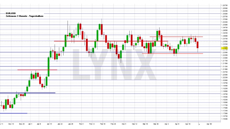 Wie angenommen setzte sich die seit mehreren Handelswochen laufende Seitwärtsbewegung im EUR.USD weiter fort und Kursbewegungen waren kaum trendfolgend handelbar. Nachdem der Markt zum Wochenstart noch einige Anläufe auf Longausbrüche wagte, fiel das Währungspaar zum Ende der Woche an die untere Seitwärtszonenbegrenzung, was am Freitag zu einem Wochenschlusskurs von rund 1,2290 führte. Es bleibt weiterhin nicht aus, für trendfolgende Handlungsansätze auf einen Ausbruch aus der Seitwärtszone zu warten. Innerhalb des Schiebezonenbereichs von 1,2240 bis 1,2390 sollte es weiterhin kaum Handelschancen geben. Sollte der Markt nach oben nachhaltig ausbrechen, wäre das Ziel 1,2460 realistisch, nach einem eventuellen Break nach unten der Bereich 1,2150.