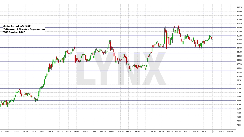 Der Blick auf die letzten 12 Monate der Ferrari-Aktie zeigt ein positives Bild. Aktuell steckt die Aktie jedoch in einer seitwärts laufenden Konsolidierung fest. Aus dem Kursbereich von rund 80,00 USD kommend entwickelte sich der Wert vorerst bis gut 130,00 USD und schwankt seit Ende Januar zwischen 130,00 und 117,50 USD. Das aktuelle Bewegungshoch liegt bei rund 131,00 USD und somit in etwa 8,50 USD höher als der Freitagsschlusskurs nahe der Marke von 122,50 USD. Aus charttechnischer Sicht ist das Aufwärtsbild trotz der aktuell laufenden Schiebezone sehr sauber, was Käufe prinzipiell auch weiterhin erlauben sollte. Oberhalb des Unterstützungslevels von rund 113,00 USD wären somit leichte Konsolidierungen gegebenenfalls interessante Einstiegssetups, wobei die Bewegungshochs von gut 131,00 USD und folgend 134,80 USD realistische Ziele darstellen könnten. Sollte der Wert jedoch dauerhaft unter die Unterstützung von 113,00 USD rutschen, wird das charttechnische Aufwärtsbild etwas unsauberer und Käufe sollten bedingt etwas zurückgenommen werden.