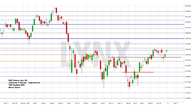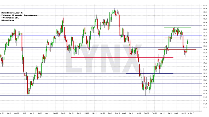 Der Deutsche Aktienindex beendete den Xetra-Handel am Freitag mit einem Plus von 0,64 Prozent bei 12.580,87 Punkten. Das Rekordhoch liegt bei 13.596,89 Punkten. Das Handelsvolumen betrug 3,977 Mrd. Euro. Der XDAX notierte um 22:15 Uhr mit 12.585,58 Punkten und der FDAX schloss an der EUREX mit 12.596,00 Punkten. Der Dow Jones beendete den Handel mit 24.311,19 Punkten und die Rekordmarke liegt bei 26.616,71 Punkten. Der NASDAQ 100 notierte zum Handelsschluss bei 6.656,35 Punkten und der Rekordstand beträgt 7.186,09 Punkte. Der breit gefasste S&P 500 schloss mit 2.669,91 Punkten und der Rekordstand liegt bei 2.872,87 Punkten. Der Euro notierte nach US-Börsenschluss bei 1,2130 US-Dollar. Eine Feinunze Gold war am Spotmarkt für 1.324,00 US-Dollar zu haben und Rohöl der Nordseesorte Brent kostete zum US-Handelsschluss im Juni-Kontrakt 74,64 US-Dollar das Fass. Der Euro-Bund-Future schloss am Freitag an der EUREX mit 158,60 Punkten. Die Rendite für zehnjährige Bundesanleihen liegt aktuell bei 0,57 Prozent. Der Spread zwischen zehnjährigen deutschen Bunds und zehnjährigen US-Staatsanleihen (2,96 Prozent Rendite) liegt derzeit bei 239 Basispunkten. Die Bundesfinanzagentur emittiert am Mittwoch im Rahmen einer Aufstockung Kapitalmarktinstrumente (Bobl) mit einer fünfjährigen Laufzeit und mit einem Volumen von 3,0 Mrd. EUR.