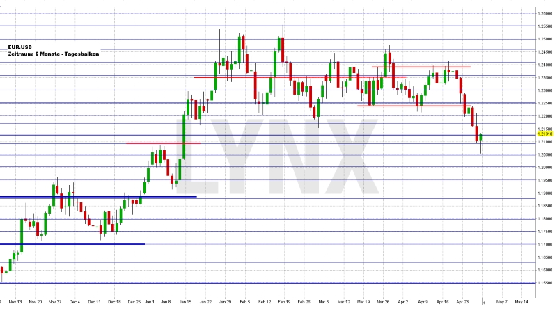 Der EUR.USD vollzog in der vergangenen Handelswoche den lange erwarteten Ausbruch aus der Schiebezone und erreichte bereits am Mittwoch das angenommene Shortziel von 1,2150. Folgend konnte ein Wochentief bei rund 1,2050 ausgebaut werden. Der Wochenschlusskurs lag nahe der Marke von 1,2130. Zu beobachten war auch, dass die Volatilität leicht zunahm. Das Vorwochentief ist aus übergeordneter Sicht ein ernstzunehmender Unterstützungsbereich, der durchaus in der Lage ist, das Währungspaar erneut in den Bereich um 1,2200 zu drücken. Aus diesem Grund könnten Kurse unterhalb von 1,2200 durchaus Anlass für Verkäufe sein. Erst ein Anstieg über dieses Widerstandsniveau würde den Abwärtsvorteil erneut relativieren und ein Rückfall in den Seitwärtszonenbereich wäre denkbar. Als realistisches Wochenziel für Verkäufe könnte die Unterstützung 1,2025 dienen.