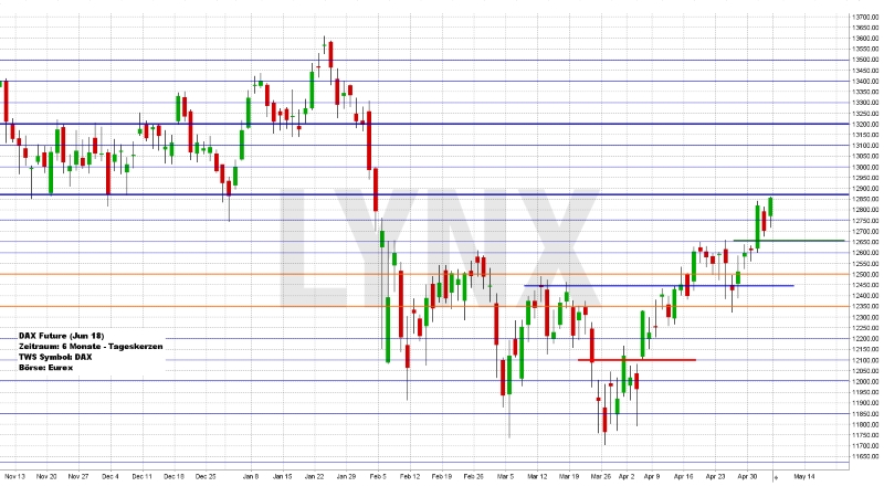 Der Deutsche Aktienindex beendete den Xetra-Handel am Freitag mit einem Plus von 1,02 Prozent bei 12.819,60 Punkten. Das Rekordhoch liegt bei 13.596,89 Punkten. Das Handelsvolumen betrug 4,585 Mrd. Euro. Der XDAX notierte um 22:15 Uhr mit 12.844,01 Punkten und der FDAX schloss an der EUREX mit 12.856,00 Punkten. Der Dow Jones beendete den Handel mit 24.262,51 Punkten und die Rekordmarke liegt bei 26.616,71 Punkten. Der NASDAQ 100 notierte zum Handelsschluss bei 6.769,12 Punkten und der Rekordstand beträgt 7.186,09 Punkte. Der breit gefasste S&P 500 schloss mit 2.663,42 Punkten und der Rekordstand liegt bei 2.872,87 Punkten. Der Euro notierte nach US-Börsenschluss bei 1,1968 US-Dollar. Eine Feinunze Gold war am Spotmarkt für 1.317,79 US-Dollar zu haben und Rohöl der Nordseesorte Brent kostete zum US-Handelsschluss im Juli-Kontrakt 74,98 US-Dollar das Fass. Der Euro-Bund-Future schloss am Freitag an der EUREX mit 159,18 Punkten. Die Rendite für zehnjährige Bundesanleihen liegt aktuell bei 0,54 Prozent. Der Spread zwischen zehnjährigen deutschen Bunds und zehnjährigen US-Staatsanleihen (2,95 Prozent Rendite) liegt derzeit bei 241 Basispunkten. Die Bundesfinanzagentur emittiert am Mittwoch im Rahmen einer Aufstockung Kapitalmarktinstrumente (Bund) mit einer dreißigjährigen Laufzeit und mit einem Volumen von 1,5 Mrd. EUR.