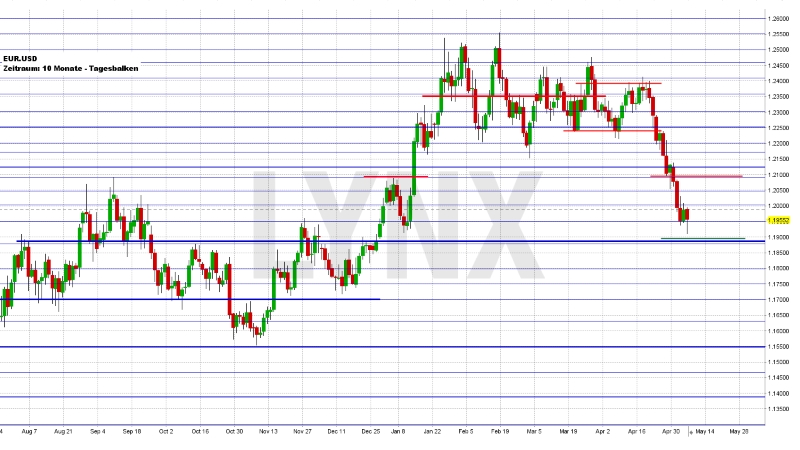 Schnell zeigte sich im EUR.USD, dass die gestartete Abwärtsbewegung der vorletzten Handelswoche fortgesetzt wird. Das Wochenziel von 1,2025 konnte bereits am Dienstag erreicht werden. Folgend kam es mehrfach zu weiteren Bewegungstiefs. Das Wochentief lag kurz vor der Unterstützung von 1,1900. Auch der Wochenschluss zum Freitagabend lag verhältnismäßig schwach im Unterstützungsbereich von rund 1,1950. Das Kursniveau von 1,1900 und etwas tiefer sollte in den kommenden Tagen als eine markante Unterstützung gesehen werden, was durchaus dazu führen könnte, dass sich der EUR/USD leicht nach oben erholen. Die Widerstände 1,2050 und auch 1,2100 wären realistisch zu erreichende Bereiche. Der Kerntrend ist jedoch weiterhin klar abwärtstendierend und Käufe sind somit als antizyklisch zu werten.