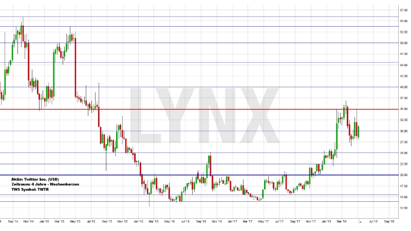 Ein Blick auf den Chartverlauf der Twitter-Aktie zeigt in den letzten vier Jahren ein eher uneinheitliches Bild, wobei der übergeordnete Kerntrend auf der Abwärtsseite zu finden ist. Aus den Hochs Ende 2014 und Mitte 2015 fand der Wert Anfang 2016, Mitte 2016 und Mitte 2017 einen Boden im Kursbereich von rund 14,50 USD, was einem Kursrutsch von gut 70 Prozent gleichkommt. Erst Ende 2017 konnte sich der Wert etwas stabilisieren und kletterte seitdem bis zum wichtigen Widerstand von 35,00 USD. Mit dem Schlusskurs der vergangenen Handelswoche bei rund 31,00 USD liegt die Aktie im Vierjahresschnitt somit dennoch leicht im Minus, obwohl die letzte Kernaufwärtsbewegung immerhin über 100 Prozent ausmachte. Es wird jetzt interessant, ob die Aktie von Twitter den wichtigen Widerstand bei 35,00 USD dauerhaft durchstoßen kann und damit die Aufwärtsseite zunehmend in den Fokus rückt. Vorsichtige Käufe oberhalb von 30,00 USD wären somit durchaus denkbar, wobei der Bruch von 35,00 USD als Grundvoraussetzung angenommen werden sollte. Eindeutiger für Käufe und somit auch die defensivere Herangehensweise wären Käufe oberhalb von 35,00 USD. Ein erneuter Rutsch unter 30,00 USD wäre aus charttechnischer Sicht eher kontraproduktiv für die Aufwärtsseite und Handlungen sollten zurückgenommen werden.