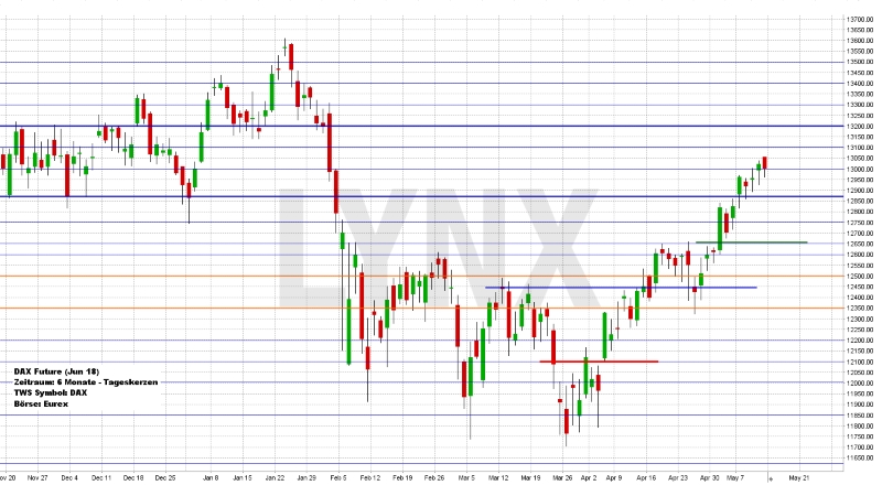 Den Widerstandsbereich von 12.850/12.900 konnte der DAX-Future (FDAX) in der vergangenen Handelswoche problemlos überwinden und damit war der Weg in Richtung des Zielbereichs von 13.000 Punkten frei. Das Wochenhoch lag knapp über 13.050 und auch der Schlusskurs zum Freitagabend lag stark im 13.000-Punkte-Bereich. Leichte Konsolidierungen boten interessante Einstiegsszenarien, da Abgaben relativ schnell immer wieder gekauft wurden. Das charttechnische Bild tendiert weiter aufwärts, wobei durch zahlreiche Widerstände immer wieder mit leichten Konsolidierungen gerechnet werden sollte. Auch eine übergeordnet notwendige größere Konsolidierung wäre denkbar. Diese könnte unterhalb von 12.900 auch zu antizyklischen Verkäufen in Richtung 12.850 und 12.750 führen. Auf der Aufwärtsseite wären Ziele wie 13.100 und 13.150 durchaus realistisch.