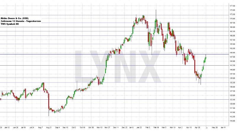 Der Blick auf den Chart der Aktie von Deere & Co. zeigt für die vergangenen zwölf Handelsmonate ein eher durchwachsenes Bild. Nachdem der Wert Mitte August kurzzeitig aus dem 132,50-USD-Bereich um mehr als 15 USD einbrach, setzte eine nicht zu verachtende Rally nach oben ein, die die Aktie bis zu einem vorläufigen Hoch von rund 172,50 USD führte. Ab Februar dieses Jahres änderte sich der Trend jedoch schlagartig und wiederholte Abwärtsbewegungen prägten das Bild. Letztlich konnte ein Tief im Unterstützungsbereich von 132,50 USD markiert werden, das zu einer Erholung an das aus aktueller Sicht richtungsentscheidende Niveau von 149,00 USD führte. Durch das doch recht unsaubere Chartbild sollte für den Wert eine gewisse Grundvorsicht gelten, da nach wie vor schnelle Richtungswechsel denkbar sind. Es wird interessant, wie der Wert mit dem Widerstand von 149,00 USD umgeht. Kurse darunter wären aus aktueller Sicht weiterhin eher abwärtstendierend und Käufe hätten gegebenenfalls keinen nennenswerten Trendvorteil. Sollte es die Aktie jedoch über diesen Widerstand schaffen, käme dies der Aufwärtsseite etwas entgegen und Kurse in Richtung 155,00 USD und folgend auch 160,00 USD wären durchaus realistisch.