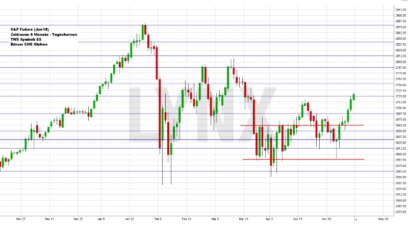 Wie angenommen konnte der S&P den Ausbruch über die Marke von 2.662,50 Punkte problemlos halten und Käufe in Richtung der Ziele 2.687,50 und 2.712,50 waren teilweise perfekte Trades. Das Wochenhoch lag am Freitag sogar oberhalb von 2.725,00, was die Stärke des Marktes mit Nachdruck untermauerte. Auch der Schlusskurs zum Freitagabend lag nahe des Wochenhochs im Bereich oberhalb von 2.725,00 Punkten. Aus charttechnischer Sicht zeigt sich für den S&P Future jetzt ein klares Aufwärtsbild und erneute Käufe oberhalb von 2.687,50 wären weiterhin denkbar. Neue Bewegungshochs sind nicht auszuschließen und derzeit gibt es nur wenig markante Widerstände im Chart. Leichte Rücksetzer könnten gegebenenfalls für interessante Einstiegsszenarien genutzt werden. Rutscht der Markt jedoch unter die Unterstützung von 2.687,50, sollten Käufe vorerst etwas zurückgenommen werden und eine situativ neue Analyse wäre anzuraten.