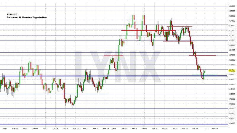 Zu Beginn der vergangenen Handelswoche rutschte der EUR.USD kurzzeitig unter das wichtige Unterstützungsniveau von 1,1900 ab und setzte erst am Donnerstag zur angedachten Erholung in Richtung 1,2000 an. Die mit Vorsicht angesetzten antizyklischen Erholungstrades führten anfänglich zu kleineren Verlusten, konnten aber zum Ende der Handelswoche durch gut laufende Käufe aufgeholt werden. Der Schlusskurs zum Freitagabend lag im Bereich 1,1940 und somit nur knapp unter dem Schlusskurs der Vorwoche. Die Unterstützung 1,1900 sollte jetzt im Auge behalten werden. Bleiben die Kurse darüber, ist es ähnlich wie in der letzten Analyse bereits skizziert denkbar, dass sich der Markt in Richtung 1,2000/1,2050 entwickeln könnte. Damit könnten antizyklische Käufe durchaus interessant werden. Rutscht der Markt jedoch erneut unter die wichtige Unterstützung von 1,1900, könnte es schnell zu Kursen in Richtung 1,1800 und folgend auch 1,1750 kommen, was prozyklische Verkäufe durchaus befürworten würde.