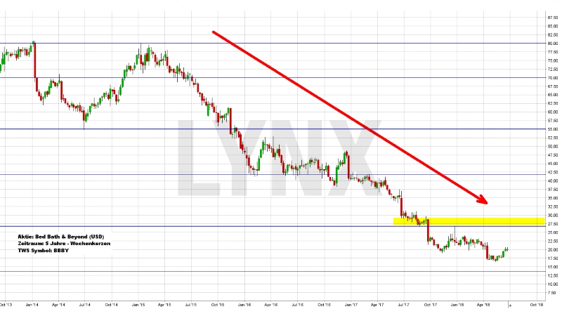 Die Aktie von Bed Bath & Beyond zeigte in den vergangenen fünf Jahren einen sauberen Abwärtstrend. Lediglich von Mitte 2014 bis Anfang 2015 konnte sich der Wert aus dem Kursbereich von 55,00 USD bis auf rund 80,00 USD entwickeln. Von dort setzte jedoch eine Abwärtsbewegung ein, die kürzlich ihren Tiefpunkt im Kursbereich von 16,00 USD fand – eine Abwärtsreise um rund 80 Prozent. Der Schlusskurs zum vergangenen Freitag konnte im Kursbereich von rund 20,00 USD abgelesen werden – eine leichte Erholung, jedoch lediglich an die letzten Bewegungstiefs heran. Käufe dieser Aktie sind aus aktueller charttechnischer Sicht keine Option. Zu stark ist der Trendvorteil auf der Abwärtsseite, zu sauber die Trendbewegung. Neue Bewegungstiefs sind nicht auszuschließen und diese könnten sich durchaus mit dem Test der letzten Bewegungstiefs im Bereich 20,00 USD relativ schnell entwickeln. Sollte sich der Wert jedoch langsam weiter aufwärts bewegen können und den nachhaltigen Sprung über den 27,00-28,00-USD-Bereich schaffen, könnte dies gegebenenfalls für eine Trendwende sprechen und die Aufwärtsseite könnte eventuell erneut eine Rolle spielen. Eine situativ neue Analyse wäre jedoch anzuraten.
