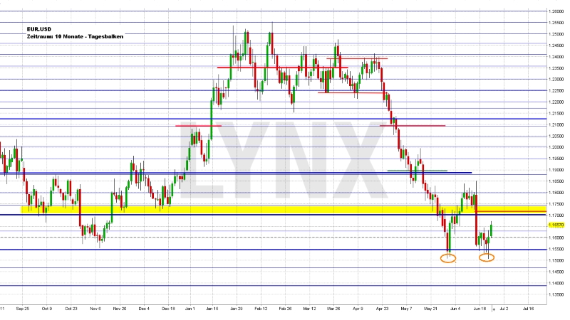 Mit Beginn der vergangenen Handelswoche setzte sich die angenommene Abwärtsrichtung erneut durch und der EUR.USD rutschte bis auf das Tief von Anfang Juni ab. Dieses konnte jedoch nicht unterschritten werden und so erholte sich das Währungspaar ab Donnerstag bis in den Bereich 1,1675. Auch der Schlusskurs zum Handelsschluss am Freitag lag im Wochenvergleich leicht im Plus und konnte im Bereich 1,1650 abgelesen werden. Unterhalb von 1,1700/1,1715 lässt sich aus dem übergeordneten Chartbild weiterhin ein Abwärtsvorteil ablesen, der durchaus zu Verkaufsszenarien führen könnte. 1,1500 und folgend 1,1400 sind weiterhin realistische Ziele. Erst ein dauerhaftes Überschreiten von 1,1715 könnte die Trendampel – wenn auch vorsichtig – erneut auf Grün umschalten lassen, was durchaus zu Kursen in Richtung 1,1800/1,1850 führen könnte. Demzufolge wären antizyklische Käufe oberhalb von 1,1715 ebenfalls denkbar.