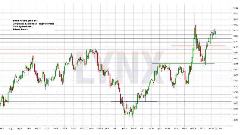 Die Aufwärtstendenz im Bund Future bestätigte sich auch in der letzten Handelswoche, wobei wie angenommen die Kraft für nennenswerte neue Bewegungshochs nachließ. Das Wochenhoch konnte im Bereich 162,60 markiert werden, etwa 40 Ticks höher als der Vorwochenschlusskurs. Auch die Volatilität des Marktes nahm ab und lag lediglich bei rund 85 Ticks. Der Schlusskurs zum Freitagabend lag im Bereich 162,45. Für die kommenden Handelstage wäre es weiterhin denkbar, dass sich die leichte Aufwärtstendenz durchsetzen kann und sich daraus folgend Bewegungshochs in Richtung 163,00 einstellen. Ein Rutsch unter die Vorwochentiefs im Bereich 161,75 könnte dieser Annahme jedoch in die Quere kommen und ein Kursrückgang in Richtung 161,00 wäre ebenfalls denkbar.