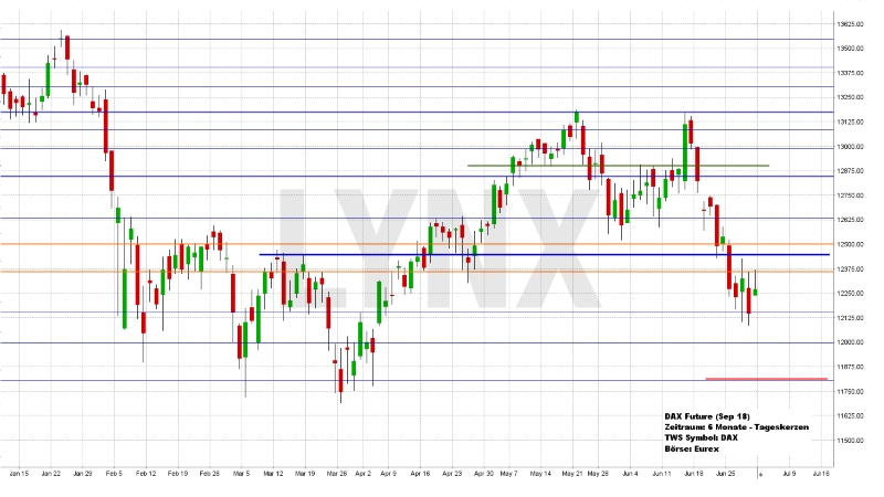Der Deutsche Aktienindex beendete den Xetra-Handel am Freitag mit einem Plus von 1,06 Prozent bei 12.306,00 Punkten. Das Rekordhoch liegt bei 13.596,89 Punkten. Das Handelsvolumen betrug rund 4,476 Mrd. Euro. Der XDAX notierte um 22:15 Uhr mit 12.285,72 Punkten und der FDAX schloss an der EUREX mit 12.271,00 Punkten. Der Dow Jones beendete den Handel mit 24.271,41 Punkten und die Rekordmarke liegt bei 26.616,71 Punkten. Der NASDAQ 100 notierte zum Handelsschluss bei 7.040,80 Punkten und der Rekordstand beträgt 7.309,99 Punkte. Der breit gefasste S&P 500 schloss mit 2.718,37 Punkten und der Rekordstand liegt bei 2.872,87 Punkten. Der Euro notierte nach US-Börsenschluss bei 1,1684 US-Dollar. Eine Feinunze Gold war am Spotmarkt für 1.252,60 US-Dollar zu haben und Rohöl der Nordseesorte Brent kostete zum US-Handelsschluss im August-Kontrakt 79,44 US-Dollar das Fass. Der Euro-Bund-Future schloss am Freitag an der EUREX mit 162,42 Punkten. Die Rendite für zehnjährige Bundesanleihen liegt aktuell bei 0,30 Prozent. Der Spread zwischen zehnjährigen deutschen Bunds und zehnjährigen US-Staatsanleihen (2,86 Prozent Rendite) liegt damit bei 256 Basispunkten.