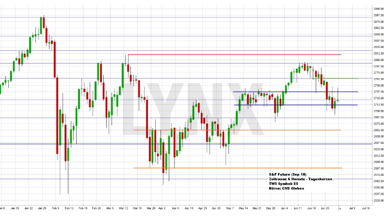 Die angesprochene Vorsicht vor einem eventuellen Rutsch des S&P Futures in Richtung 2.712,50 hat sich bewährt und Verkäufe konnten recht interessant umgesetzt werden. Das Wochentief lag kurzzeitig sogar unterhalb von 2.700,00, was weitere Abwärtsgedanken nach zwischenzeitlichen Erholungsphasen interessant machte. Der Schlusskurs zum Freitagabend befand sich an dem wichtigen Kursbereich von 2.724,00 und somit rund 35 Punkte tiefer als in der Vorwoche. Mit Blick auf das übergeordnete Chartbild wäre es jetzt durchaus denkbar, dass die Aufwärtsseite Schwung gewinnt und es den S&P Future somit erneut nach oben treibt. Käufe – vorzugsweise oberhalb von 2.737,50 – wären somit durchaus eine Überlegung wert. Unterhalb von 2.712,50 ständen aus charttechnischer Sicht jedoch weiterhin alle Vorzeichen klar auf Rot und erneute Bewegungstiefs in Richtung 2.670,00 wären denkbar.