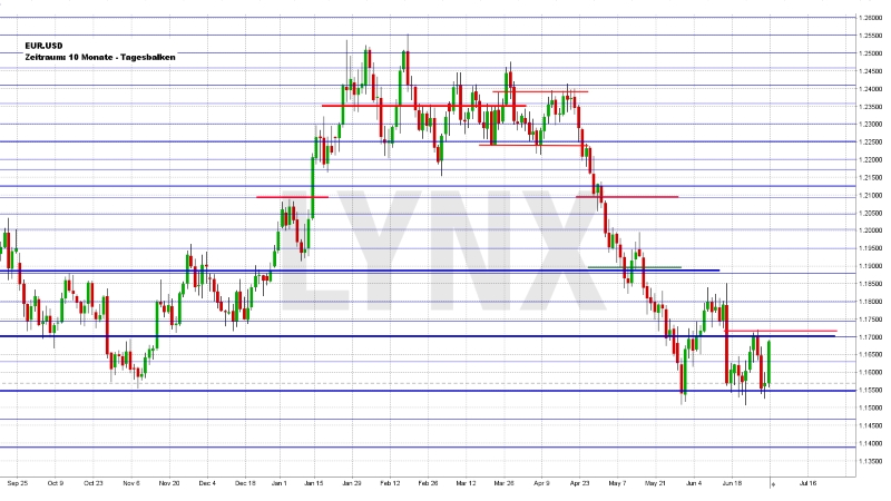 In der vergangen Handelswoche scheiterte der EUR.USD mehrfach daran, den wichtigen Widerstand von 1,1715 zu überwinden. Die Folge war ein erneuter Rutsch des Marktes in Richtung der aktuellen Bewegungstiefs knapp vor der Marke von 1,1500. Neue Bewegungstiefs wurden jedoch nicht ausgebaut und so konnte das Währungspaar Stärke sammeln und stieg zum Wochenschluss erneut bis kurz vor den 1,1700-Punkte-Widerstand. Alles in allem war die letzte Handelswoche also seitwärtstendierend. Die bereits für die Vorwoche erwogene Herangehensweise bleibt auch für die kommende Woche in annähernd gleicher Form bestehen. Schafft der EUR.USD den Sprung über 1,1715, wären weitere Aufwärtsbewegungen in Richtung 1,1800/1,1850 durchaus realistisch und Käufe kämen in Frage. Sollte es jedoch erneut abwärts gehen und sich Kurse unterhalb von 1,1650 einstellen, wären Kurse in Richtung 1,1500 und folgend 1,1400 ebenfalls denkbar und somit Verkäufe interessant.