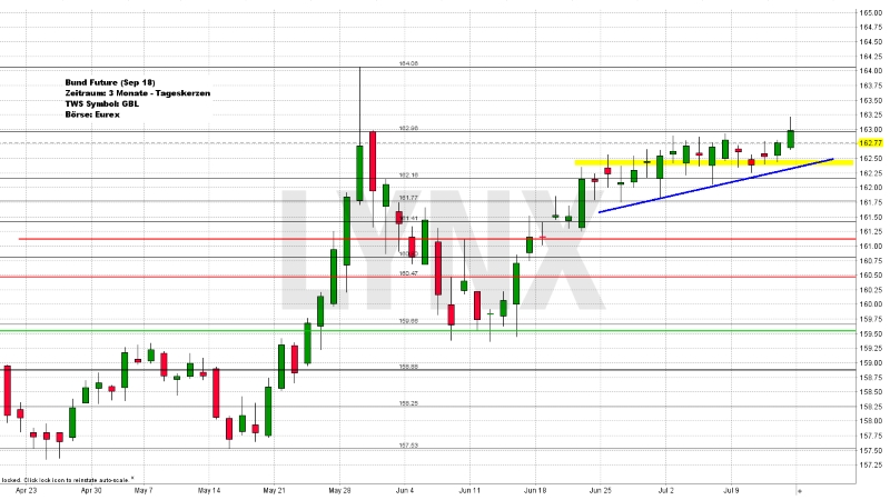 Wie angenommen war der Kursbereich 162,25 in der vergangenen Handelswoche richtungsentscheidend. Am Montag und Dienstag konsolidierte der Bund-Future leicht in diesen Bereich, um ab Mittwoch die angedachte Aufwärtsreise weiter fortzusetzen. Zum Freitag brach der Bund durch die Marke von 163,00 nach oben aus und markierte ein Wochenhoch knapp vor 163,25 Punkten. Der Freitagsschlusskurs lag knapp unterhalb von 163,00 Punkten. In der kommenden Handelswoche sollte oberhalb von 162,50 grundsätzlich die Aufwärtsseite weiterhin Bestand haben und Käufe in Richtung 163,50 wären denkbar. Es ist jedoch grundsätzlich zu beobachten, dass die aktuelle Aufwärtsphase sehr schleppend verläuft, wodurch eine Anfälligkeit für Abwärtsereignisse erhöht sein könnte. Sollte sich also unter Umständen Short-Momentum aufbauen, so wären auch antizyklische Shorttrades in Richtung 162,00 und folgend 161,75 möglich.