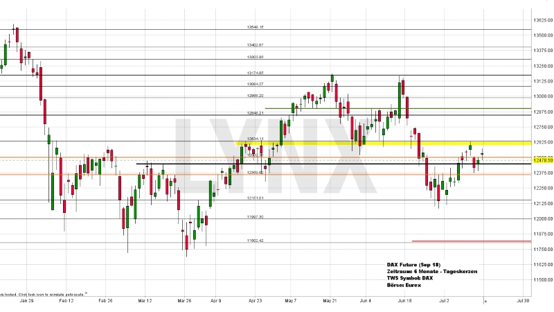 Wie angenommen konnte der DAX-Future (FDAX) zu Beginn der letzten Handelswoche neue Bewegungshochs in Richtung 12.600 Punkte ausbauen, bis er von dort eine leichte Konsolidierungsbewegung in den kernunterstützenden Bereich von 12.375 Punkten startete. Von da ab wendete sich das Blatt erneut und der Markt konnte bis zum Freitagsschlusskurs auf gut 12.500 Zähler steigen. Wie angenommen ist der Bereich 12.600/12.625 eine starke Widerstandszone, die auch in den kommenden Handelstagen eine Barriere darstellen könnte. Das erste Ziel für Käufe sollte der Bereich 12.625 sein, jedoch auch Käufe oberhalb von 12.450 wären grundsätzlich eine Option. Nur mit weiterhin starken US-Märkten und folgend deutlichen Aufwärtsimpulsen im DAX wäre ein Ausbruch in Richtung 12.800 Punkte möglich. Dieser könnte sich eventuell mit etwas stärkerem Momentum entladen. Sollte es jedoch erneut unter den unterstützenden Bereich von 12.450 gehen, wären nennenswerte Kaufchancen vorerst vom Tisch und vorsichtig könnten Shortgedanken zum Zuge kommen.