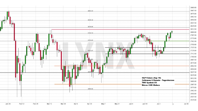 Gleich am Montag der vergangenen Handelswoche schoss der Markt weiter nach oben und der 2.800-Punkte-Bereich war in greifbarer Nähe. Mittwoch setzte jedoch eine leichte Konsolidierung ein, die als Verschnaufpause für neue Bewegungshochs oberhalb von 2.800,00 gewertet werden konnte. Der Wochenschlusskurs zum Freitagabend lag knapp oberhalb von 2.800,00 Punkten und somit nur knapp unterhalb der Wochenhochs. Jetzt wird interessant, wie der S&P mit der Marke von 2.812,00 umgeht, die das Hoch von Mitte März darstellt. Ein Erreichen ist realistisch und auch ein Überschreiten in Richtung 2.830,00 ist unter charttechnischen Gesichtspunkten nicht ausgeschlossen. Käufe oberhalb von 2.780,00 sind somit denkbare Handelsszenarien. Sollte es jedoch merklich unter die Unterstützung bei 2.780 Punkten gehen, könnte sich eine übergeordnete Konsolidierung einstellen und Kurse in Richtung 2.750,00 wären ebenfalls denkbar.