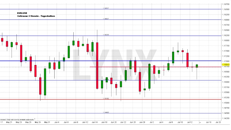 Zu Beginn der vergangenen Handelswoche konnte sich der EUR.USD kurzzeitig nach oben vorarbeiten, bevor ab Dienstag mehr und mehr die Abwärtsseite das Ruder übernahm und das Währungspaar am Freitag das Wochentief nur knapp vor der Marke von 1,1600 ausbaute. Der Schlusskurs am Freitagabend lag dann jedoch wieder etwas höher nahe 1,1680 und somit nur knapp unterhalb der wichtigen 1,1700-Punkte-Marke. Für die kommenden Handelstage sollte der Bereich 1,1675 im Auge behalten werden. Kurse darüber wären, ähnlich wie in der Vorwoche, für Käufe interessant, wobei vorerst das Ziel 1,1750 als realistisch erscheint. Sollte es jedoch unter 1,1675 gehen, wäre es denkbar, dass der übergeordnete Abwärtstrend erneut aufgenommen wird und die Tiefs nahe 1,1520 angegriffen werden könnten.