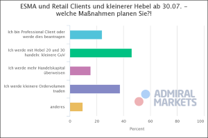 Ab dem 01. August 2018 unterliegt der Forex- und CFD-Handel in Europa neuen, deutlich strengeren Regeln als bisher. Für alle Kunden in der EU bringt die Umsetzung der Richtlinien der Regulierungsbehörde ESMA einiges an Veränderungen. Insbesondere die Begrenzung der verfügbaren Hebel sorgt dafür, dass Handelsstrategien angepasst und neu überdacht werden müssen. Künftig ist für Forex-Majors ein Hebel von höchstens 30 und für Index-CFDs wie dem DAX30 von höchstens 20 vorgesehen. Bei CFDs auf andere Basiswerte liegt er sogar noch tiefer. Der internationale Forex- und CFD-Broker Admiral Markets setzt die neuen Regeln bereits zum Wochenstart am 30.07.2018 um.Wie die Kunden auf diese Einschnitte reagieren, wollte Admiral Markets wissen und hat am 10. Juli eine Blitzumfrage unter aktiven Tradern im Rahmen eines Tradingwebinars durchgeführt. Von 293 Teilnehmern des Events haben 43% an der Umfrage teilgenommen und folgende Antworten gegeben:24 Prozent planen, als Professional Clients zu traden, die von den Regulierungsmaßnahmen zum Schutz der sogenannten Kleinanleger nicht betroffen sind und weiterhin als Profi einen hohen Hebel erhalten können. 45 Prozent gaben in der Umfrage an, sich mit den geringeren Hebelstufen abzufinden und künftig damit zu handeln. 17 Prozent planen, deutlich mehr Handelskapital zu nutzen und weitere 38% werden kleinere Ordervolumen bewegen. Die letzten 10 Prozent planen anderes, was beispielsweise die Einstellung des Handels von CFDs bedeuten kann oder auch die Suche nach Brokern, die nicht in der EU reguliert sind.„Mit dem Thema der ESMA-Regulierung haben sich mittlerweile die meisten unserer Kunden auseinandergesetzt, aber es herrscht immer noch eine große Nachfrage an qualitativ hochwertigen Informationen zu diesem Thema“, erklärt Jens Chrzanowski, Leiter der Zweigniederlassung Berlin von Admiral Markets UK Ltd. „Daher war es uns wichtig, ein Stimmungsbild zu erhalten, wie die CFD-Trader in Deutschland mit der neuen Regulierung umzugehen planen.“Der CFD-Handel ist ab August weiterhin möglich, nur die Kapitalanforderungen werden deutlich erhöht, da aus der Sicht der ESMA zu viele Kleinanleger mit zu hohem Hebel zu viel Geld verlieren. Diese europaweite Regulierung ist in der Branche hochumstritten, insbesondere da die deutsche Aufsichtsbehörde BaFin erst im Herbst 2017 den CFD-Handel bereits überprüft und keine Hebelbeschränkung verfügt hat. Warum Aufsichtsbehörden bei Prüfung des gleichen Sachverhalts in so kurzer Zeit zu so unterschiedlichen Einschätzungen kommen, ist eine unbeantwortete Frage vieler Kunden.„Es herrscht enormer Informationsbedarf, deshalb wird Admiral Markets in der Woche des Inkrafttretens eine Woche lang alle regulären Webinare umbenennen und intensiv über die neuen ESMA-Maßnahmen informieren“, führt Chrzanowski weiter aus. „Unser Handelstag startet normalerweise um 08:30 Uhr mit dem Webinar ‚Guten Morgen DAX-Index‘ – in der ‚ESMA-Woche‘ ab 30.07. wird dies zu ‚Guten Morgen ESMA‘ umfirmiert. DAX-Handelsstrategien mit den neuen Hebelgrößen und vieles mehr werden wir dann zusätzlich betrachten.“Es folgen börsentäglich anstatt „Punkt 10 – Am Puls der Märkte“, welches zu „Punkt ESMA“ wird, sowie weitere reguläre Webinare. Kurz: Es wird das Thema des Jahres eine Woche lang intensiv von allen Seiten betrachtet. Der Terminplan der Webinare in der ESMA-Woche ist auf der Homepage von Admiral Markets unter https://admiralmarkets.de/wissen/webinare abrufbar.