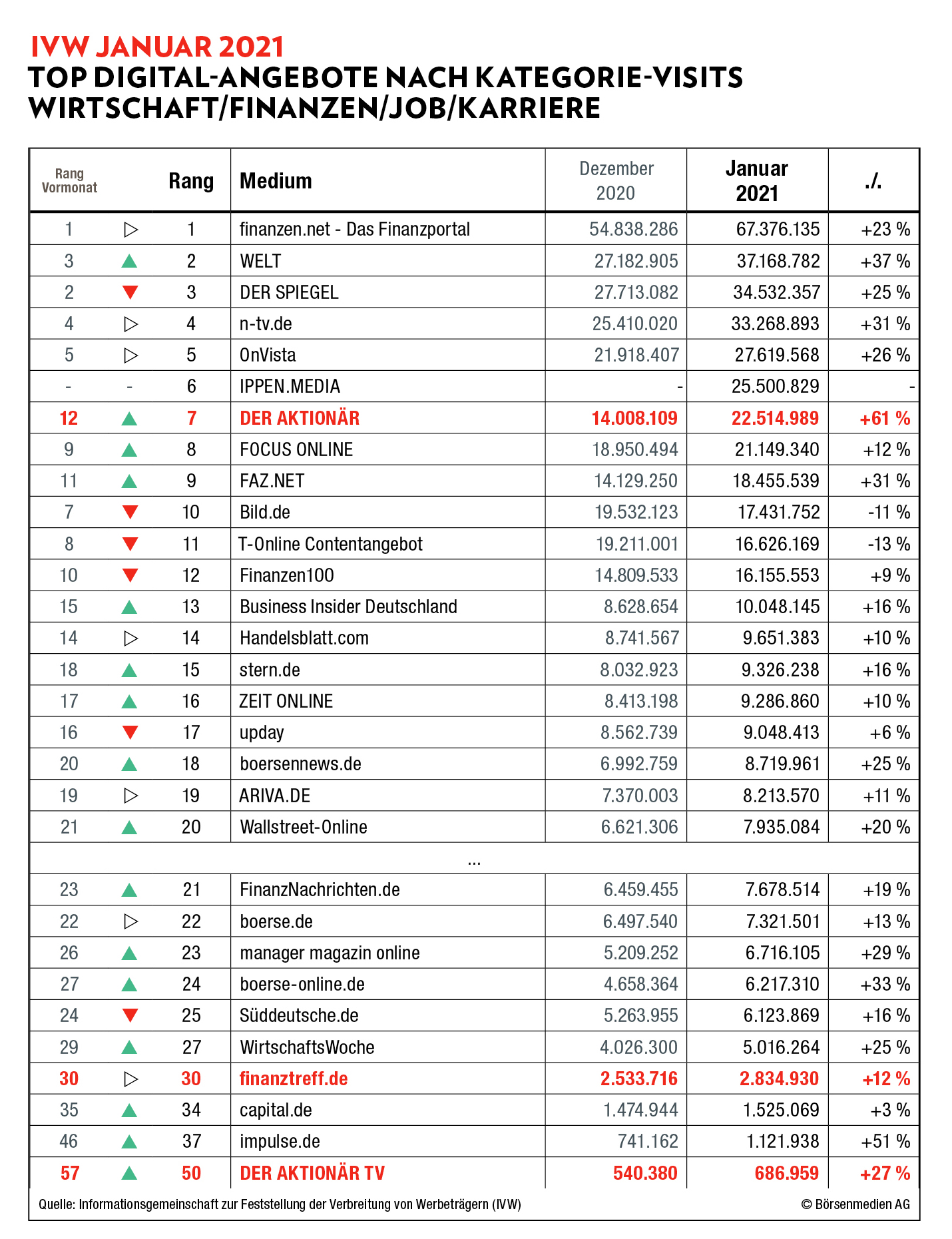 Im Wettbewerbsvergleich kann DER AKTIONÄR im Januar durch überdurchschnittlich hohes Wachstum überzeugen. In der maßgeblichen IVW-Kategorie „Wirtschaft / Finanzen / Job / Karriere“ steigert das Anlegermagazin seine digitale Reichweite um 61 Prozent gegenüber Dezember und verzeichnet damit das stärkste Wachstum unter allen Websites in den Top 50.