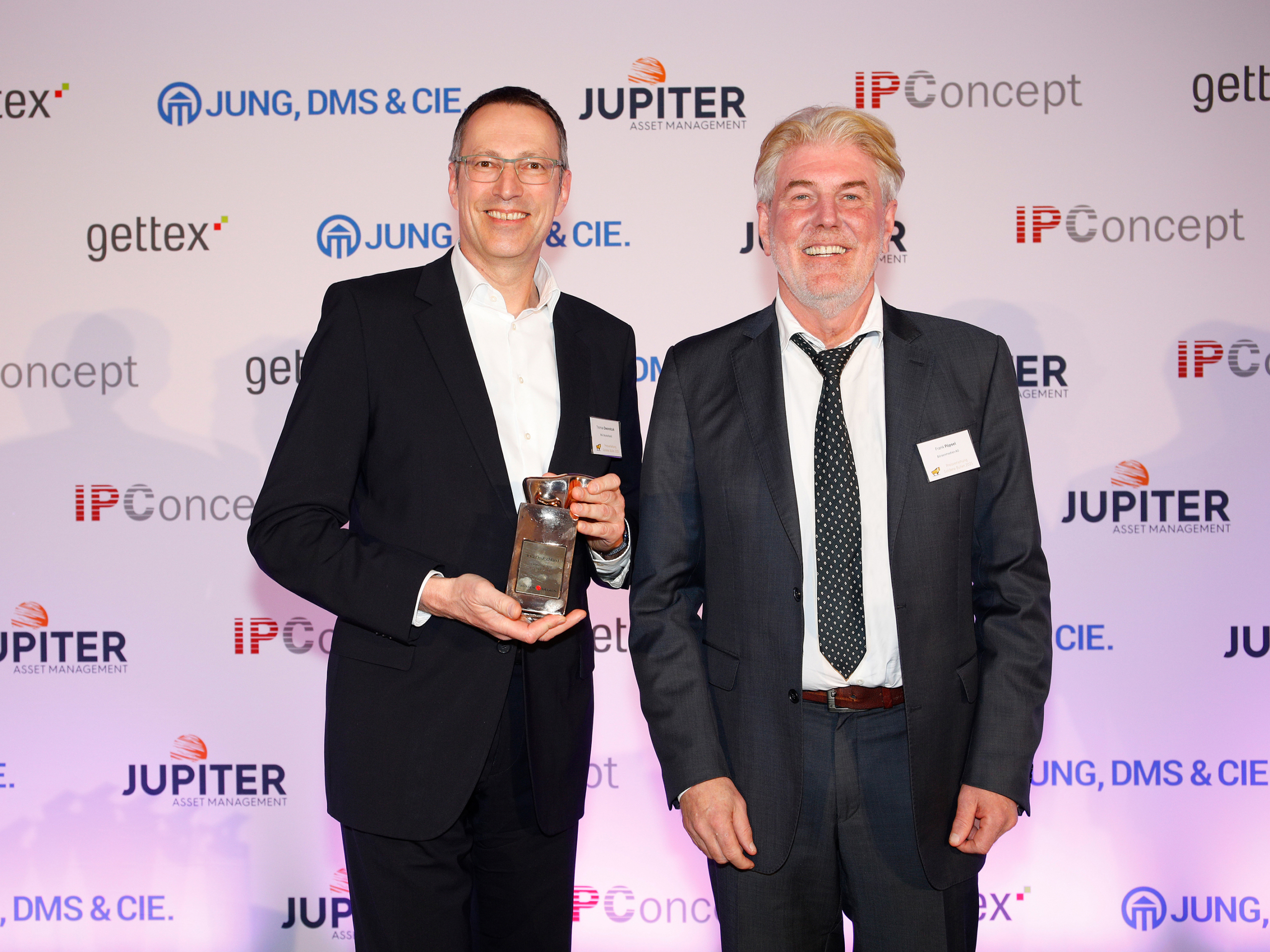 Als „Fondsspezialist des Jahres“ wird die Gesellschaft mit weniger als 40 aufgelegten Fonds ausgezeichnet, die mit ihren spezialisierten Anlagestrategien einen besonderen Mehrwert für Anleger schafft. Die ODDO BHF Asset Management GmbH überzeugte mit einer innovativen und nachhaltigen Fondsstrategie sowie dem besten Durchschnittsrating über alle Produkte hinweg. Stellvertretend wurde der Preis an Peggy Seyfert, Senior Sales Wholesale Management, und Hilko de Brouwer, Global Head of Sales, überreicht.