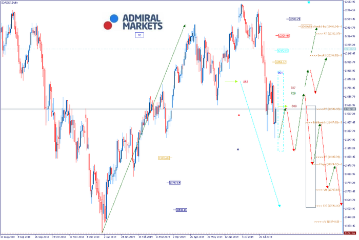 Dow Jones Analyse: Der derzeitige Kursverlauf spiegelt diese Uneinheitlichkeit perfekt wider. Anhand der gestrichelten Pfeillinien erkennen Sie beispielhaft denkbare Verlaufsformen, wie sie dieser Markt in den nächsten Tagen ausbilden könnte.