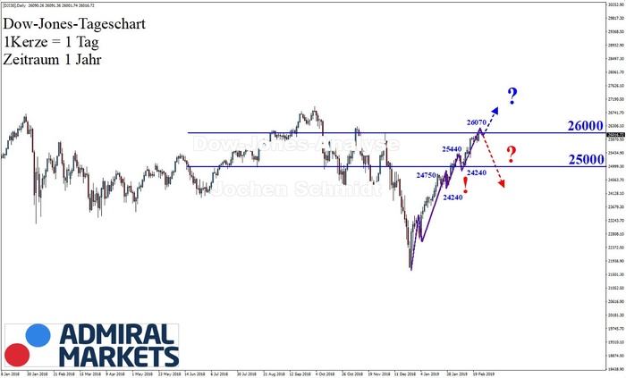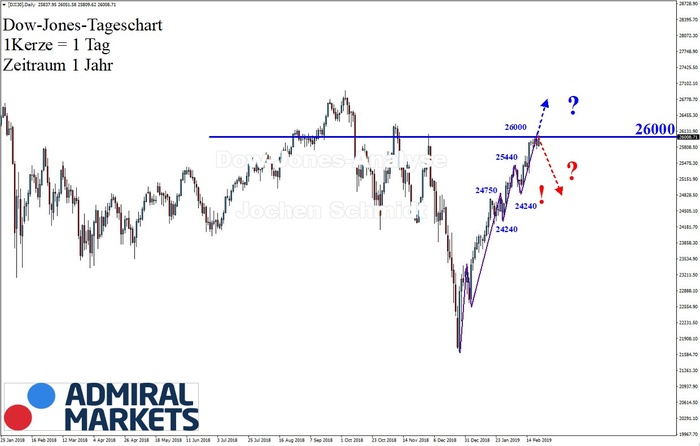 Sollten sich die Preise um den Bereich der 26.000 halten, besteht eine hohe Wahrscheinlichkeit dafür, dass sich der „Dow" in Richtung seiner höchsten Hochs weiterbewegt.