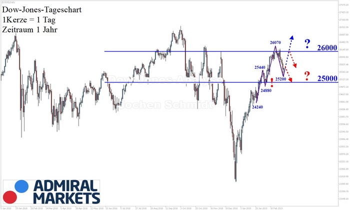 Dow Jones: Solange sich die Preise über der 25.000er-Marke halten, besteht eine hohe Wahrscheinlichkeit für erneute Anstiege in Richtung der 26.000 oder darüber.