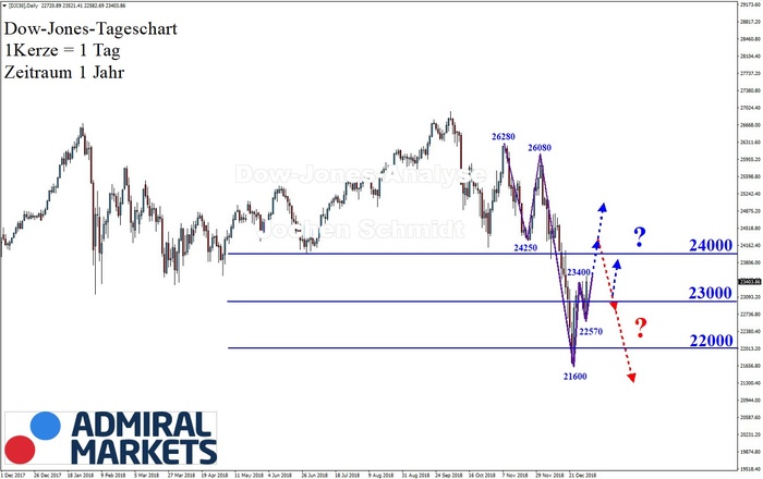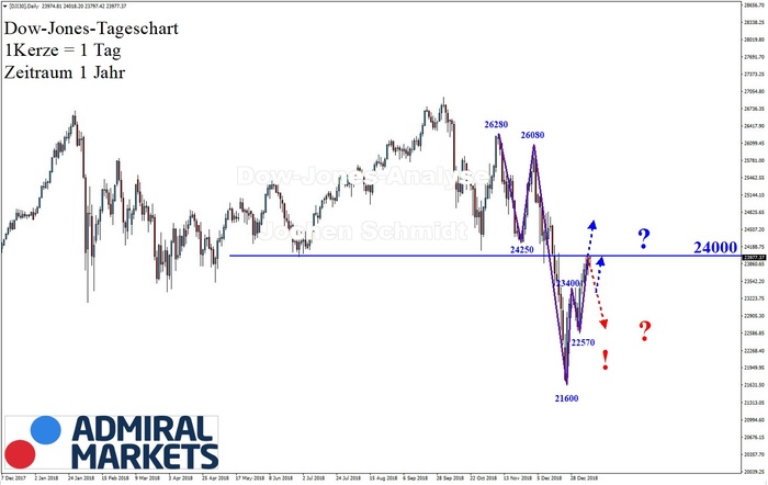 Damit das zunehmend bullische Szenario erhalten bleibt, ist es von großer Wichtigkeit, dass weitere Kursanstiege möglichst mit hohem Volumen und sichtbarer Geschwindigkeit unterlegt über die 25.000 steigen und sich darüber auch halten. Trifft dies zu, ist ein weiterer druckvoller Anstieg nach Norden denkbar.