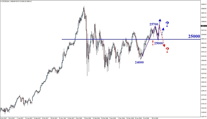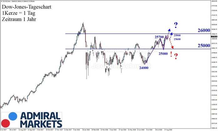 Sollten die Preise unter die 25.600 rutschen und schließen sind weitere Preisabschläge denkbar, was jedoch dem großen Trend nichts anhaben kann, solange hierbei die 25.000er-Marke unberührt bleibt.