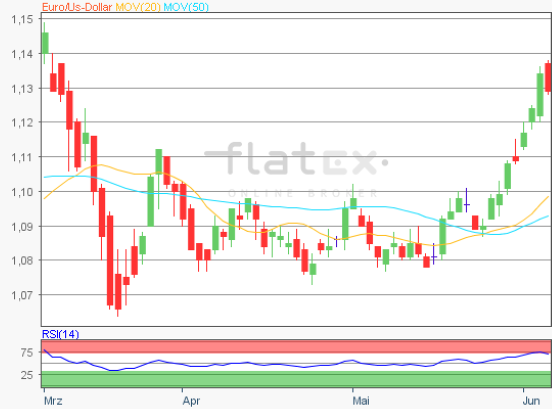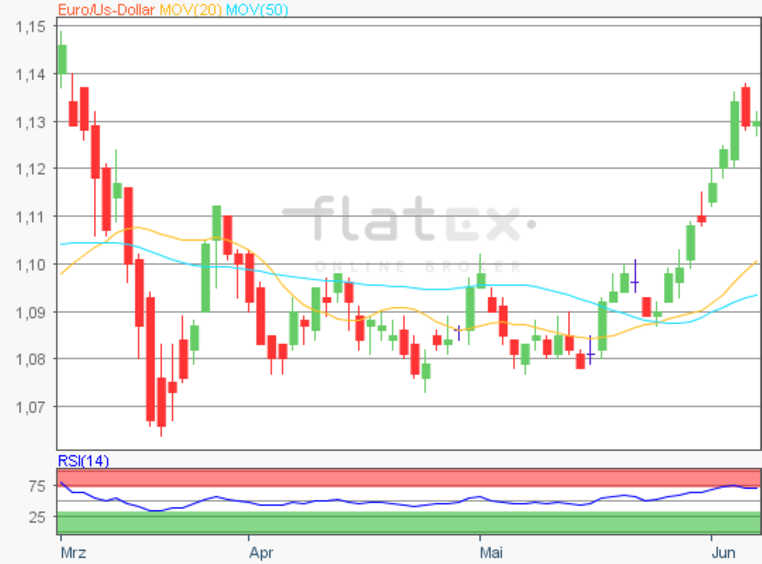 Das Währungspaar EUR/USD konnte sich trotz einer leichten Erholung des Greenback im Zuge der überraschend gut ausgefallenen US-Arbeitsmarktdaten für den Mai in Reichweite der Marke von 1,13 halten.